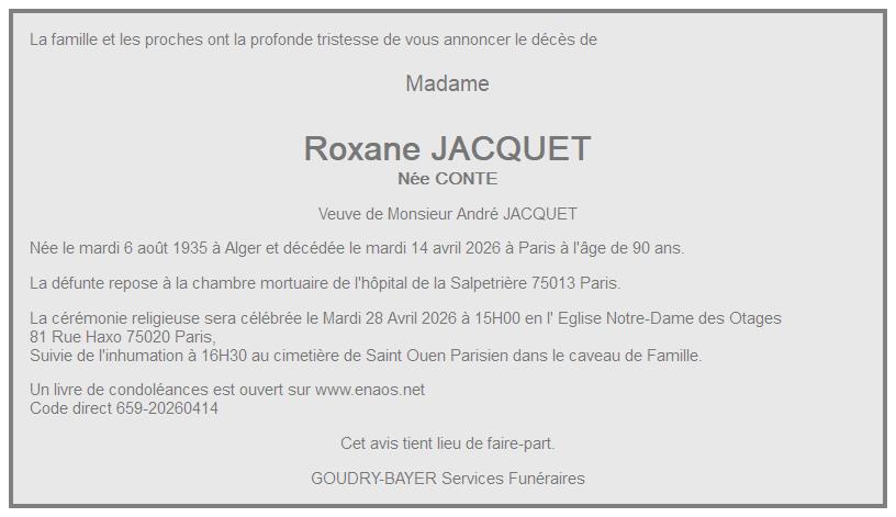 Avis de décès de Madame Roxane JACQUET née CONTE